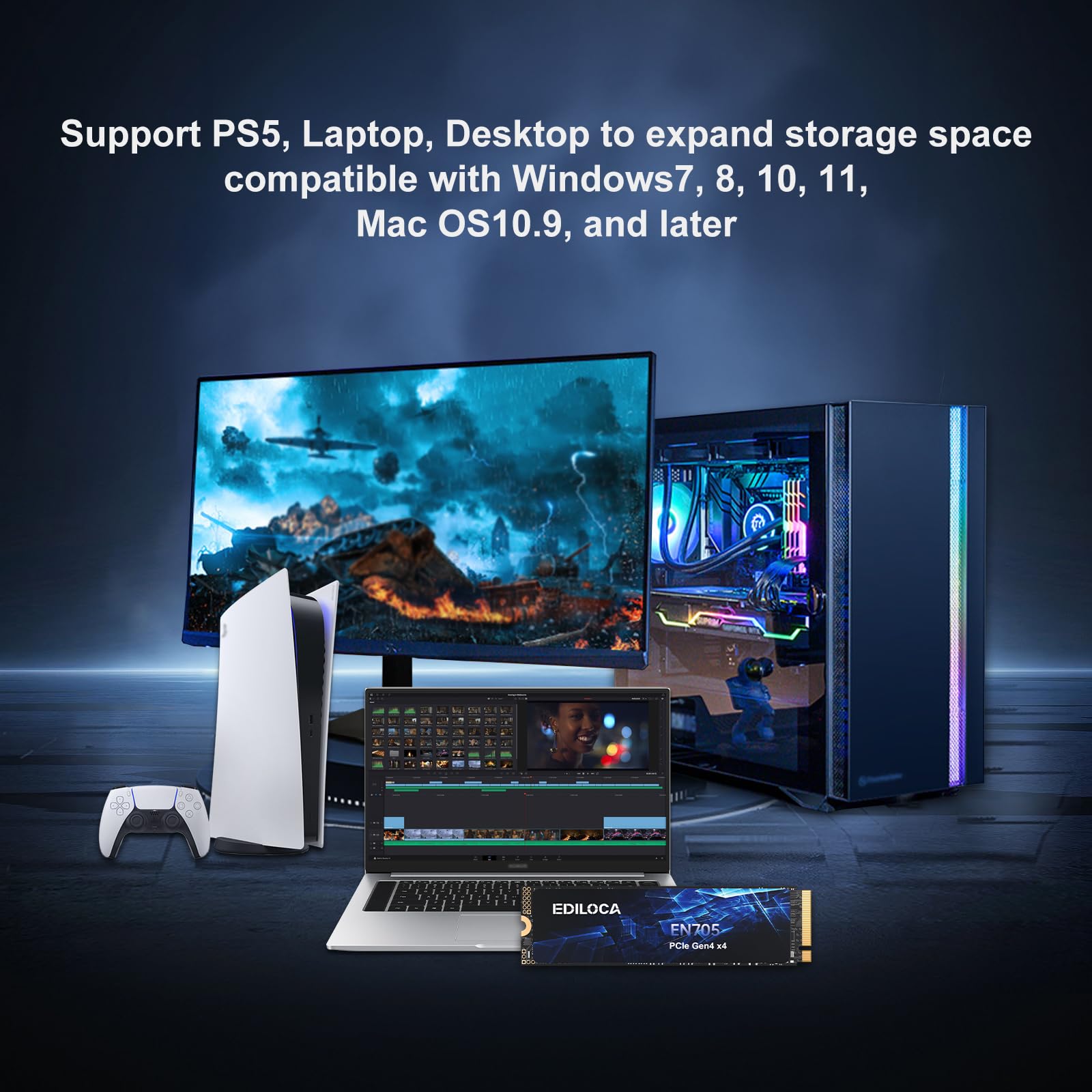 EN705 PCIe 4.0 SSD: Offers speeds up to 4800/4500 MB/s, ideal for gamers, professionals, and creatives. M.2 2280 form factor for PS5, desktops, and laptops. Efficient thermal control, high performance, and reliability for large-scale applications. Compatible with Windows 7/8/10/11 and Mac OS 10.9+.